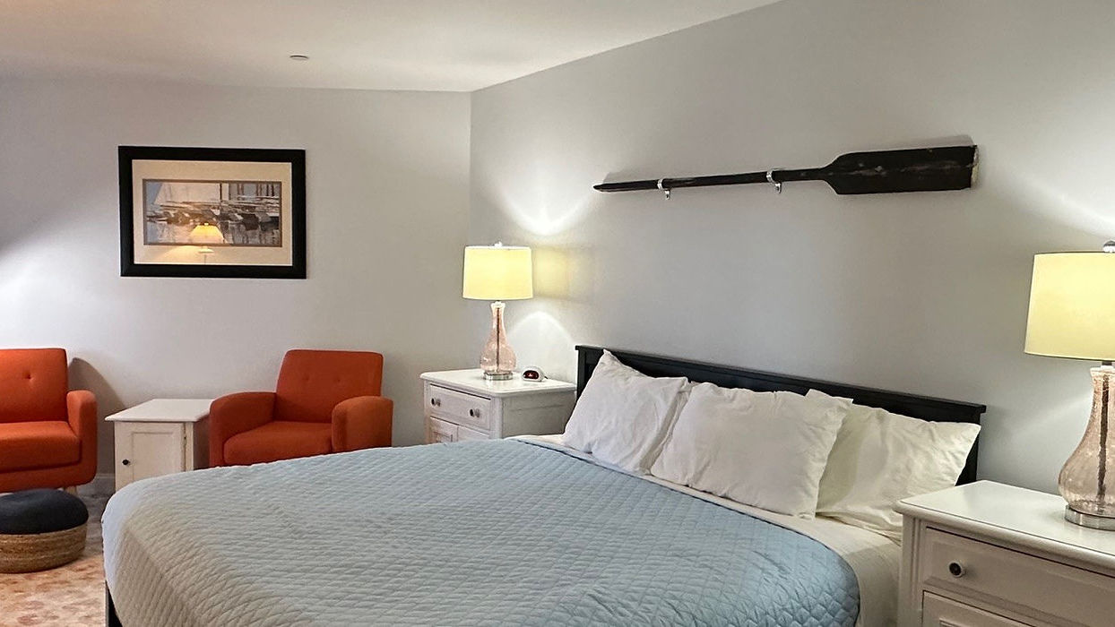 This newly remodeled second floor room with a full river view. This room is located in the Inn, has one king bed, outdoor balcony and one bathroom.